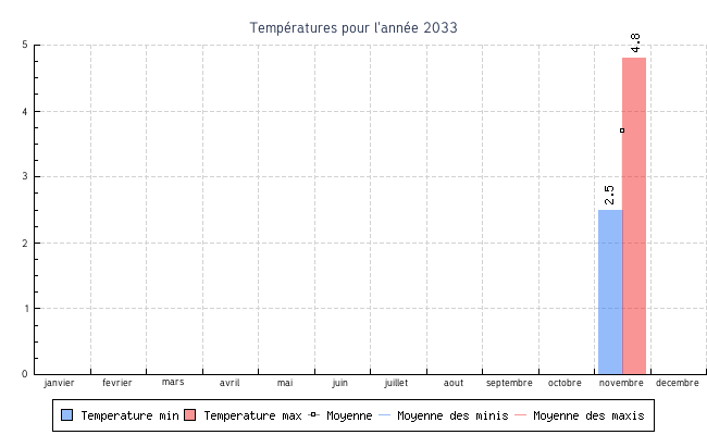 | novembre | 2.5 °C | 2.5 °C | 4.8 °C | 4.8 °C | 3.7 °C | 0.1 km/h | 0.0 km/h | N |